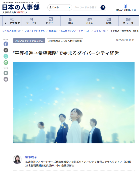 人事ポータル「日本の人事部」の専門家コラムに記事「“平等推進→希望戦略”で始まるダイバーシティ経営」が掲載されました