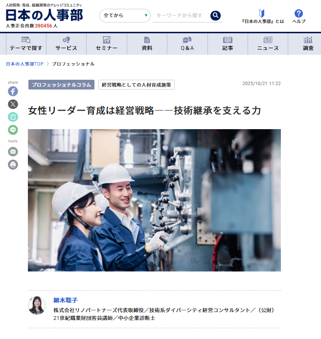 人事ポータル「日本の人事部」の専門家コラムに記事「女性リーダー育成は経営戦略――技術継承を支える力」が掲載されました