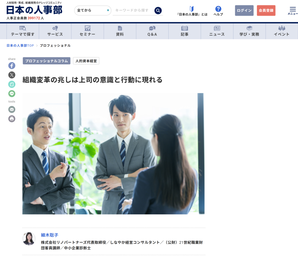 人事ポータル「日本の人事部」の専門家コラムに記事「組織変革の兆しは上司の意識と行動に現れる」が掲載されました