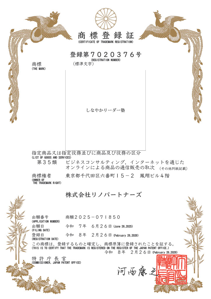 株式会社リノパートナーズの核となる次世代リーダー育成プログラム「しなやかリーダー塾®」が、正式に商標登録されました。日頃よりご支援くださる皆様に、心より感謝申し上げます。