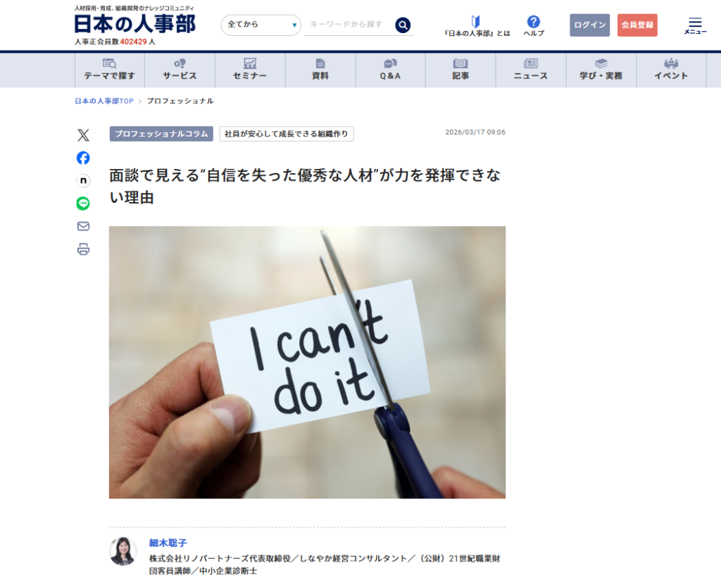 人事ポータル「日本の人事部」の専門家コラムに記事「面談で見える“自信を失った優秀な人材”が力を発揮できない理由」が掲載されました
