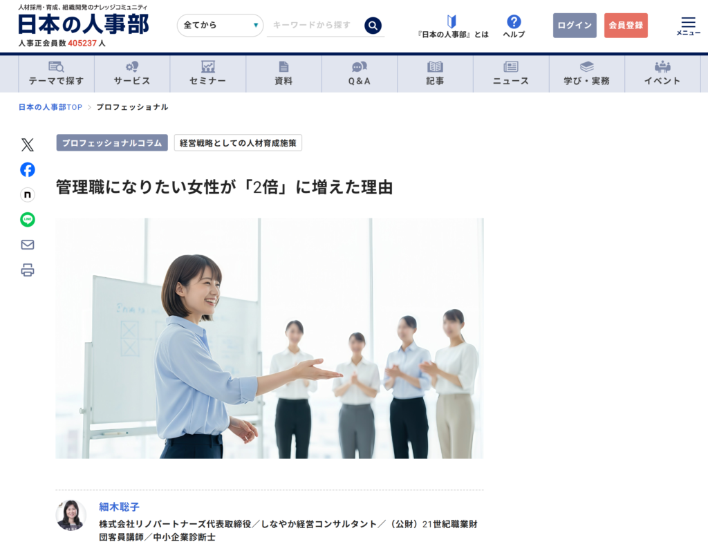 人事ポータル「日本の人事部」の専門家コラムに記事「管理職になりたい女性が「2倍」に増えた理由 」が掲載されました